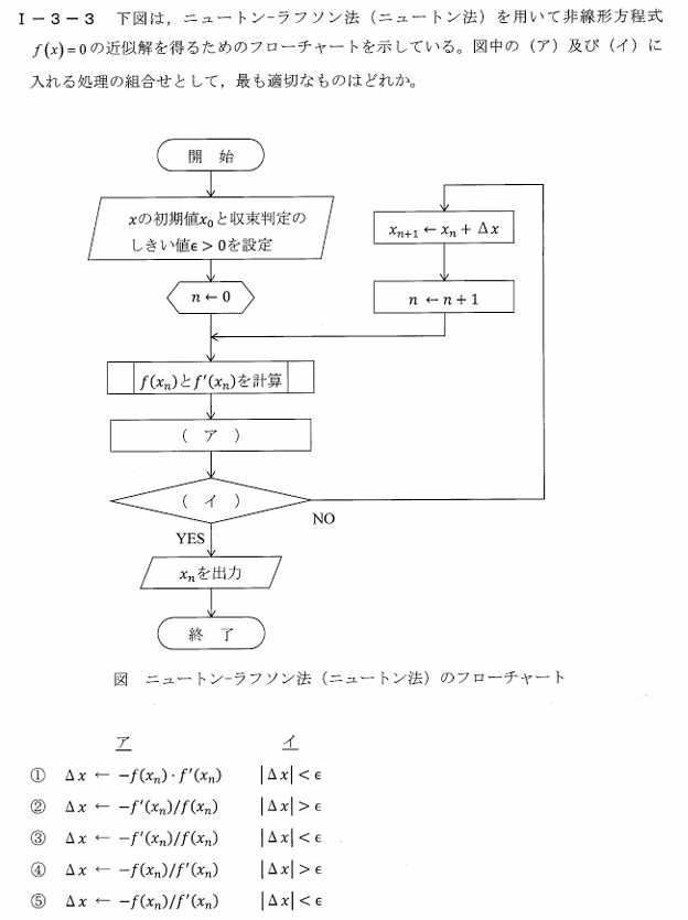 空欄(ア)は更新量 \( Δx \) を作る式、(イ)は収束判定かなと思います。