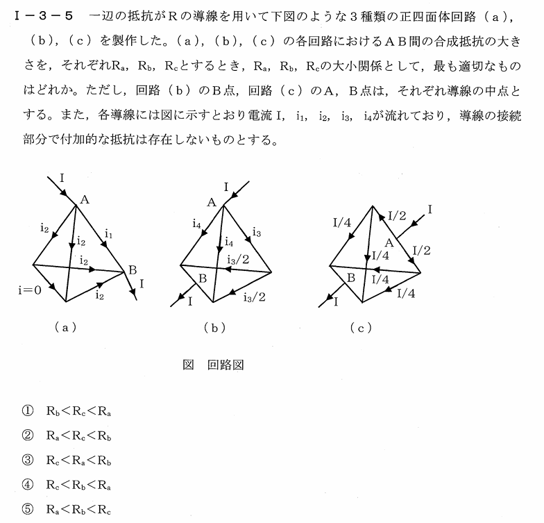 同じような正四面体回路ですが、それぞれの図の中にヒントが隠されていましたので、それらを活用することで解答にたどり着くことができます。