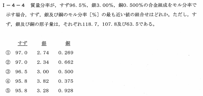 解答は⑤ すず:95.8、銀:3.28、銅:0.928 ですね。